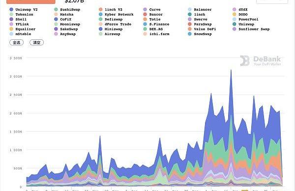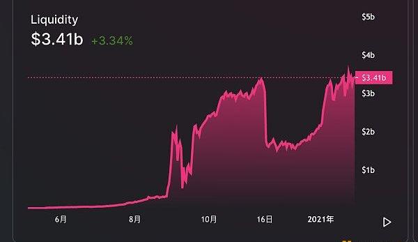 到目前来看,Uniswap的可提供流动性高达34亿美元。此前因sushiswap的迁移,Uniswap的流动性池的锁仓量出现了上图的缺口。