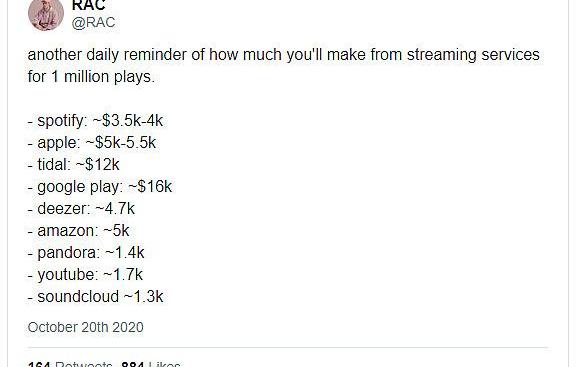 流媒体是后瘟疫时代艺术家的主要收入来源,但如今盈利极少,Spotify等数字服务提供商(DSPs)的版税仅为每百万次播放几千美元。下面列出了主流知名流媒体收费平台的收入: