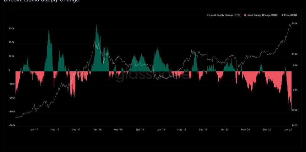 Glassnode统计的比特币30天流动性变化图表显示,比特币正在经历自2017年以来最严重的流动性枯竭,资金不仅从交易所中撤出,比特币也在流入持有大量比特币的“鲸鱼”手中,这些持币者是真正的“价值投资者”,不会轻易卖掉手中的币。
