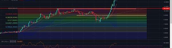 未来一天,如果多头突破最近的小阻力位12.9598美元,我们可能会看到更多新高。支持这一偏见的是,如果RSI在78点的超买区域,在未来几天在该区域爬行,我们可能会看到更多的上行空间。