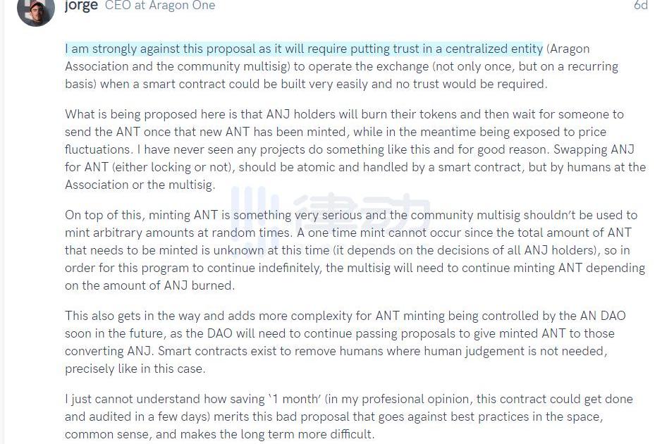 据了解,该提案通过当天,Aragon社群里就有很多人表示反对。比如ANT的持有者就认为,ANJ合并兑换为ANT,ANT的供应量要增发超过54万枚,「对ANT持币者没有好处也没有补偿」并不合理。
