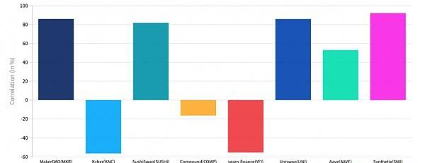 头部EthereumDeFiDApp代币MKR、Sushi、Uni、AAVE和SNX在过去30天内与比特币价格呈现出60%至80%的相关性。