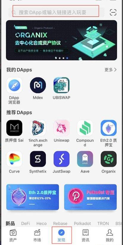 3.创建成功后在“发现”--“搜索栏”输入Mdex进入交易界面。
