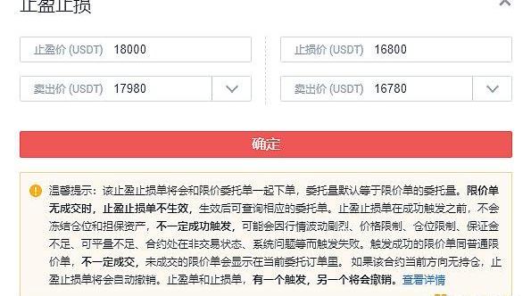 2、用户认为如果行情跌到16800USDT则支撑点无力,行情可能会大幅度下跌,因此想要在16800USDT的价格设置止损;同时认为行情达到18000USDT可能进行回调,所以想在18000USDT的价格设置止盈。那么用户在开仓时同时设置止盈和止损: