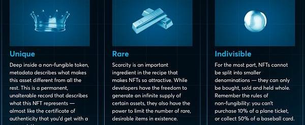 NFT是艺术品、不动产或收藏品等非可替代资产的代币化版本。非同质化代币拥有使其独特和有价值的属性和个体特征。