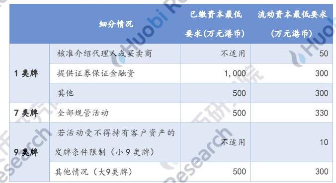进一步,主动申请方面需符合相关本地主体注册、负责人员、持牌代表机制、合格高管及经营团队、最低资本金缴纳等基本要求。根据SFC2020年7月公布的《发牌手册》,1、7、9号牌照需符合下表最低资本要求。整体来看,通过申请1号牌优先展开OTC等经纪业务或是性价比最高的方式。