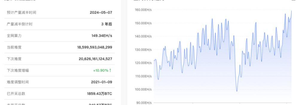 据QKL123数据显示,1月8日,比特币全网算力为149.34E,较去年同期上涨约42%。当前全网挖矿难度为18.6T,而根据预测,1月9日,比特币挖矿难度还将上调10.9%。