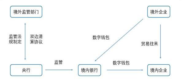 有所不同的是,在央行数字货币的语境下,没有账户的概念,而是只有数字钱包的概念。以DC/EP为例,由于DC/EP采用“双层运营体系”,因此境外企业可以注册安装由境内银行开发的央行数字货币钱包,当需要进行跨境支付时,由境内银行提供运营服务,直接将资金转入对方钱包,而央行负责日常监管。同时,为了防止资金通过该体系外流,可以设置额度管理。当然,在此条件下,如果境内外企业不通过SWIFT进行资金归集和集中调拨等跨境支付以及账单收取,那么将摆脱对SWIFT的依赖。