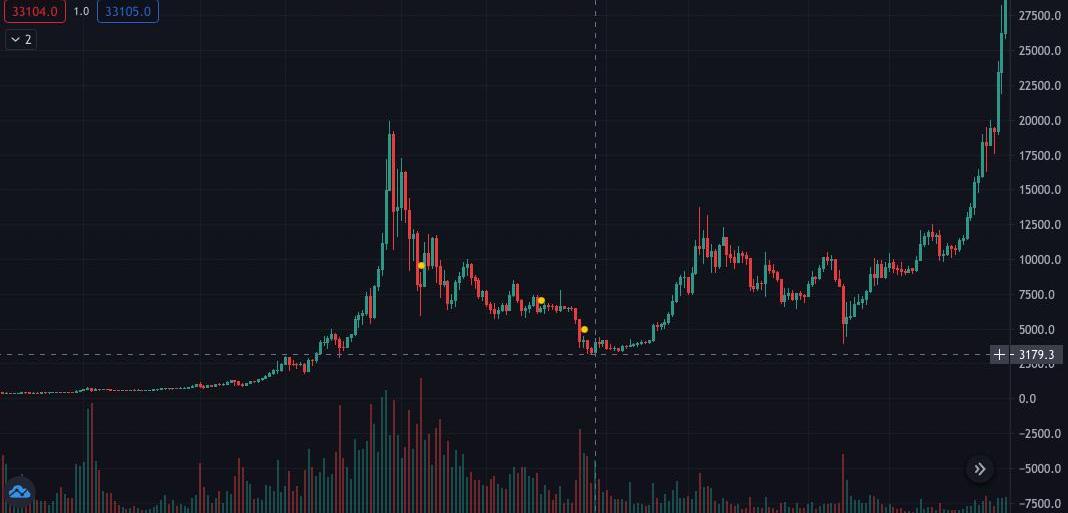 随着后续利差开始回升,比特币的避险属性会更着重显现。目前,比特币牛市先于黄金牛市,比特币的避险属性来自于外汇挤兑,黄金的避险属性来自于信用对冲。短期来看需要注意技术性回调,下图是2015--2016年比特币的走势,需注意拥挤交易后的多头平仓带来的大幅回调。