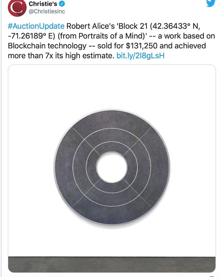 拍卖更新:RobertAlice的“Block21”,一件基于区块链技术的作品以131250美元的价格售出,达到了其最高估价的7倍以上。