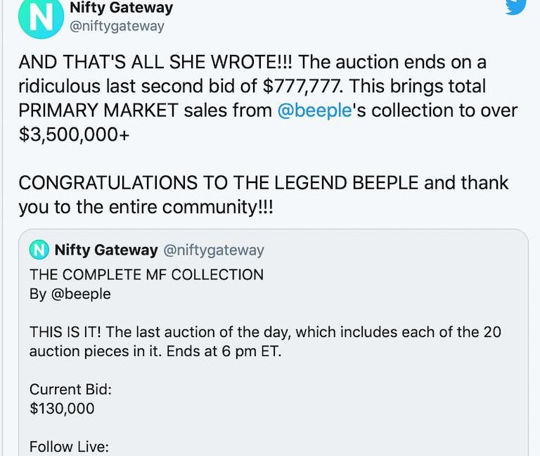 这就是她的作品!!拍卖以最后一秒777777美元的出价结束。这使得@beeple的藏品在初级市场的总销售额超过350万美元。