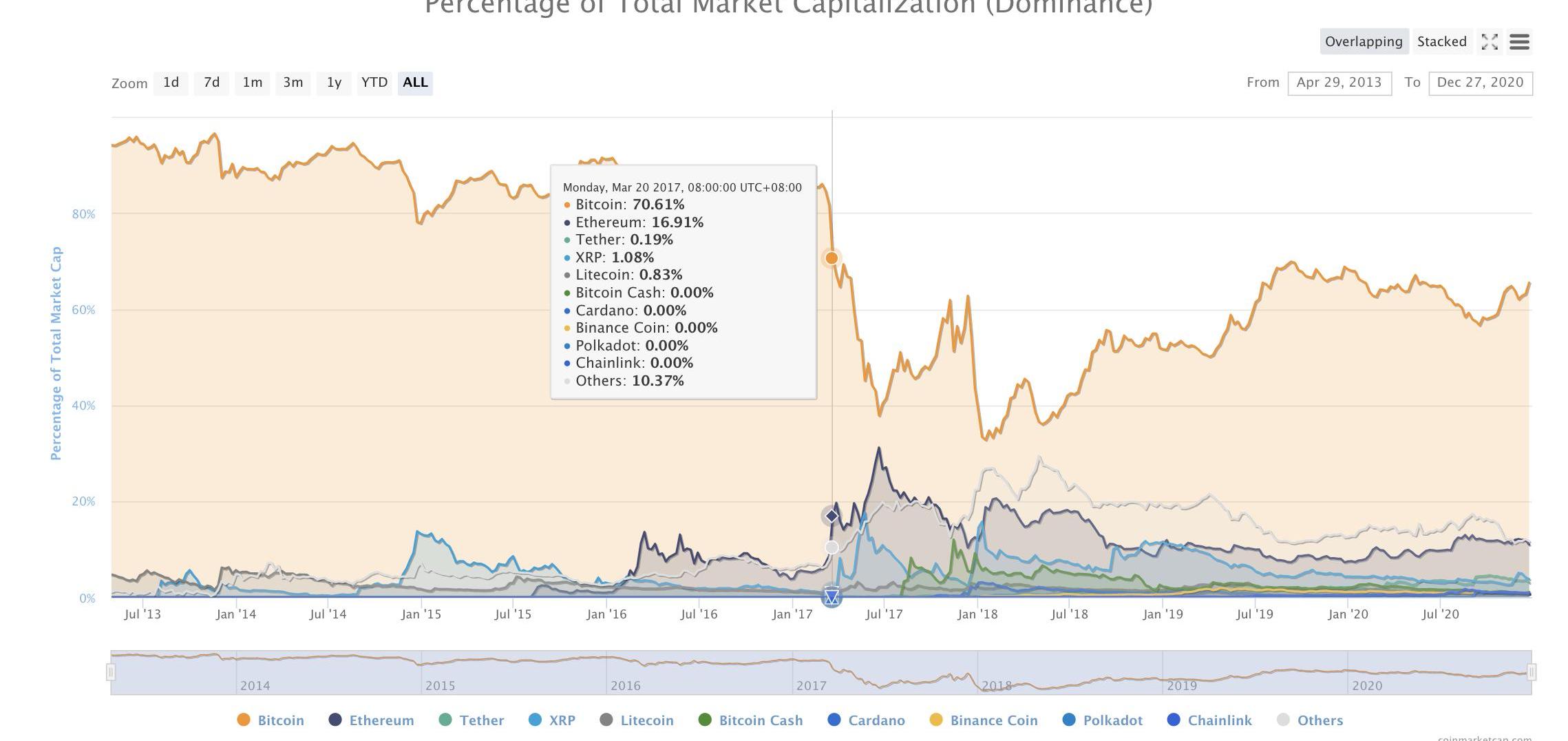 根据CoinMarketCap数据线,比特币市值在整个加密货币市值中的占比已经突破70%,创下了2017年3月以来的新高。