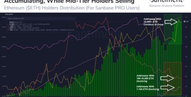鲸鱼囤积以太坊而散户在卖出。虽然比特币一直创下历史新高,但以太坊尚未重新达到其2018年创纪录的1,432美元的峰值。在撰写本文时,以太坊的交易价格约为730美元,比三年前的纪录高位低近50%。