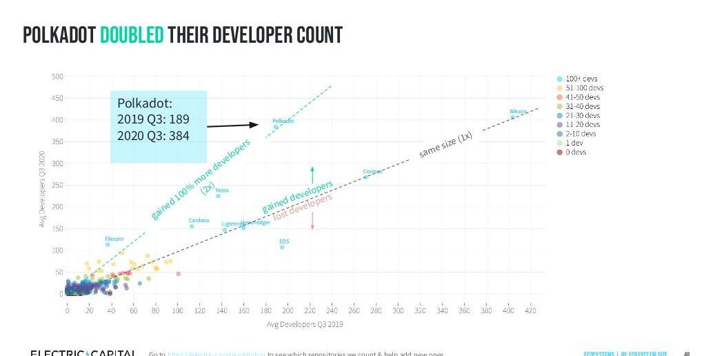 受益于波卡网络的发展,2020年其开发者数量急剧上涨。加密风投公司ElectricCapital近日发布的《区块链开发者报告》显示,相比于2019年第三季度的189位开发者,截止2020年第三季度,波卡的开发者数量到384位,同比增长103%。