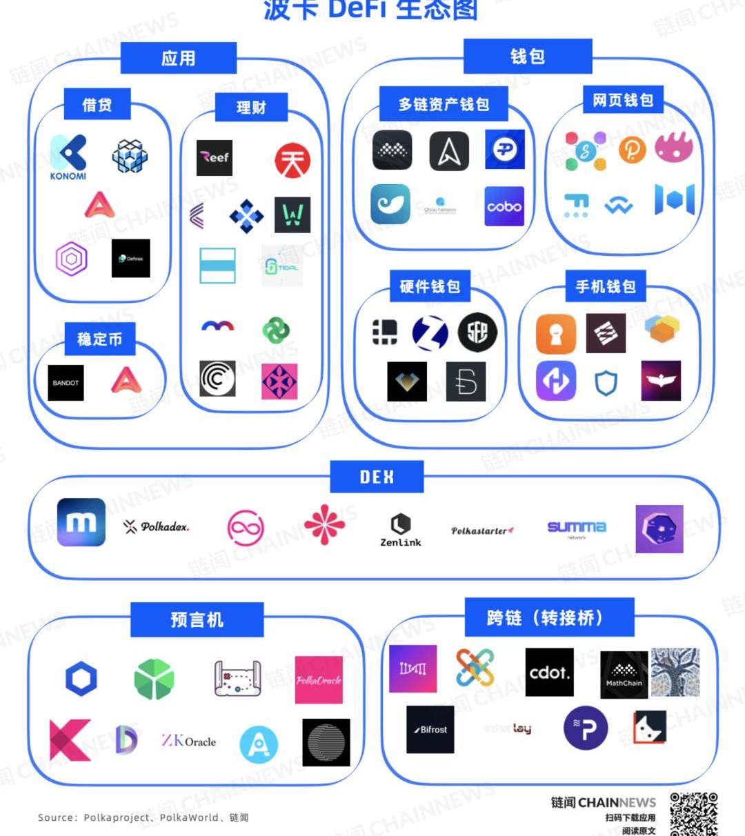 链闻根据对波卡目前的DeFi项目进行归类与总结,将其分为跨链、预言机、应用、DEX和钱包五类,对其生态进行剖析。