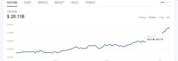 1月4日,以太坊链上的交易手续费达到了22730ETH,是以太坊有史以来的第四高位。同期以太坊挖矿的区块奖励约合12992ETH,手续费为矿工带来的收入是区块奖励的1.75倍。1月6日,以太坊上DeFi协议总锁仓量突破前高,达到了281.1亿美元。