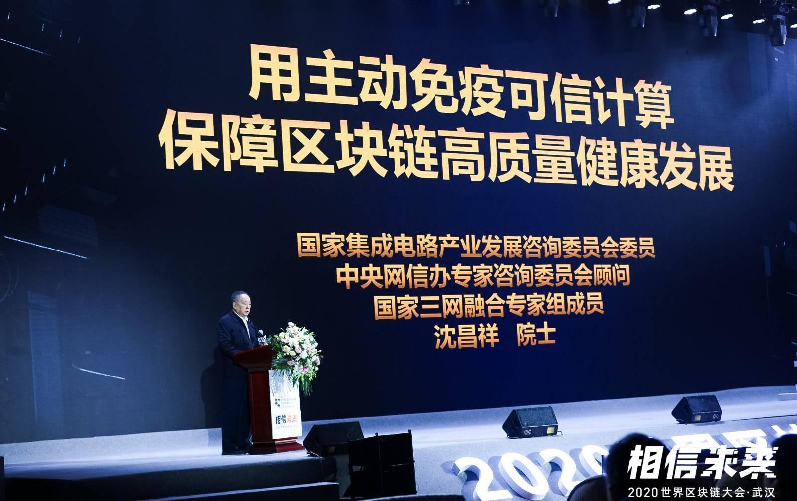 开幕式上,中国工程院院士沈昌祥发表了题为《用主动免疫可信计算,保障区块链高质量健康发展》的演讲。