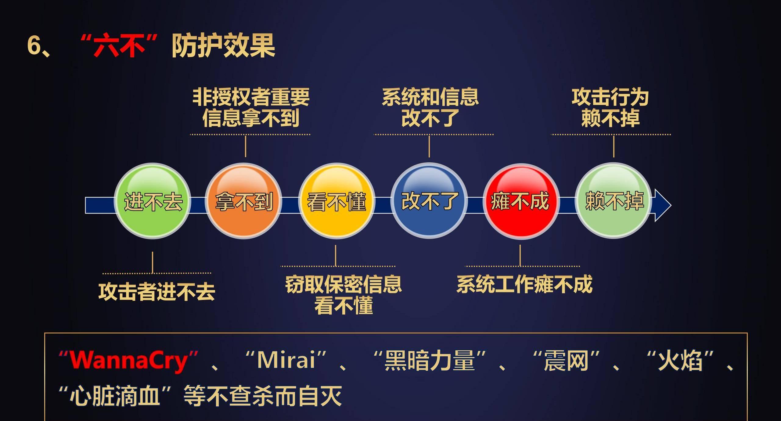 6、“六不”防护效果我们要定时的检视检查,发现隐患要去解决。更重要的是如果发现不法行为要打击、要处分,有人攻击,我们要顶住,要反击,所以这样的系统要能保证系统的数据可信,才能达到很好的效果。首先是进不去,攻击者进不去;进去了以后,没有授权拿不到东西;拿到东西以后,也看不懂;想篡改也不行,系统和信息都改不了;瘫不成,异常情况,系统工作瘫不成;赖不掉,攻击行动赖不掉。不管有什么样的程序,不能打补丁,所有内容都是不查杀而自灭的。