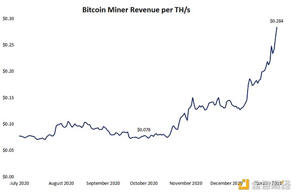10月初,矿工每TH/s算力的收入约为0.078美元。