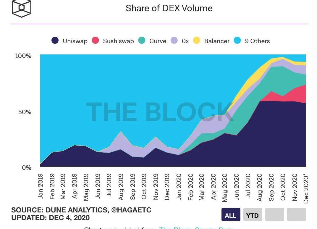 在这方面,Uniswap没有失去任何优势。前一个半月,在UNI奖励期间以及之后的两周内,市场份额保持不变。