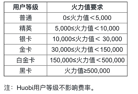 2月13日,火币全球站发布《Huobi用户等级规则与VIP权益升级公告》,宣布升级用户等级规则与VIP权益,用户VIP等级与对应权益将由“火力值“决定。火力值越高,等级越高,享受的VIP权益也会更多。“火力值”可通过交易、持仓数字资产方式获得。为回馈HT用户还特别规定,持有HT的用户可获双倍火力值,从而加速用户升级VIP等级。