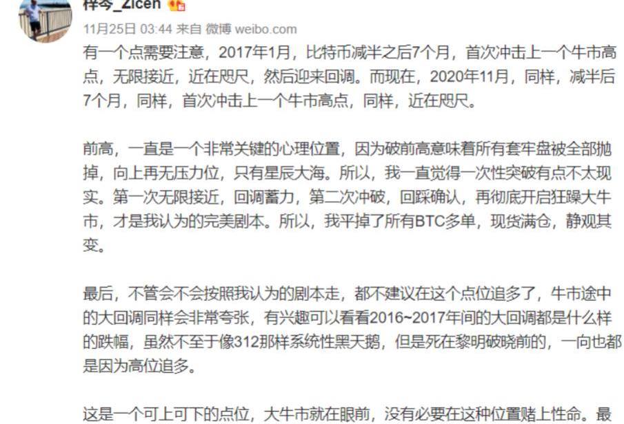 HelloEOS创始人梓岑在微博表示:前高,一直是一个非常关键的心理位置,因为破前高意味着所有套牢盘被全部抛掉,向上再无压力位,只有星辰大海。所以,我一直觉得一次性突破有点不太现实。第一次无限接近,回调蓄力,第二次冲破,回踩确认,再彻底开启狂躁大牛市,才是我认为的完美剧本。