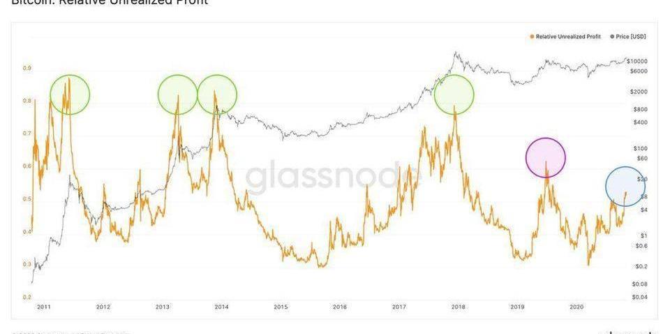 BTC的相对未实现利润显示了所有存在的币的总利润,其实现时的价格低于当前的价格,并按市值标准化。