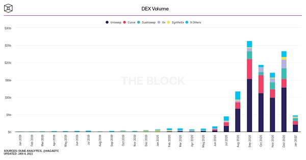 Uniswap、Curve、Balancer 等 DEX 无疑在 2020 年给了我们意料之外的惊喜,尤其是在 Uniswap 的带领之下,成为挑战 CEX 的“现象级对手”