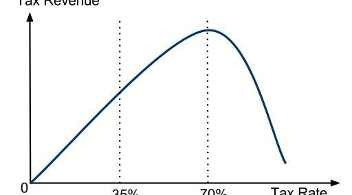 拉弗曲线告诉了我们:零税率不会增加收入,100%的税率也不会增加收入,因为在这样的情况下,没有人会想去工作,但是中间的某个税率会增加最多的收入。关于收益最大化的税率是多少存在争议,但总的来说,人们普遍认同如下所示的图表: