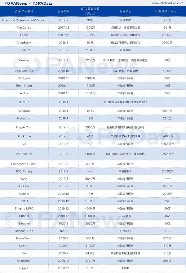 据PANews不完全统计,2017年到2020年期间,SEC至少起诉了32个加密项目,罚款总额超1.4亿美元。其中,Tezos、Block.one和Telegram的罚款金额位于前三。