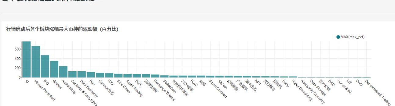 我们继续通过数据分析,所有进入板块的币种里面,哪些板块的单个币种涨幅是最大的。结果跟上面那张图差不太多。诞生了最大涨幅币种的板块分别是:AI、市场预测、游戏概念。