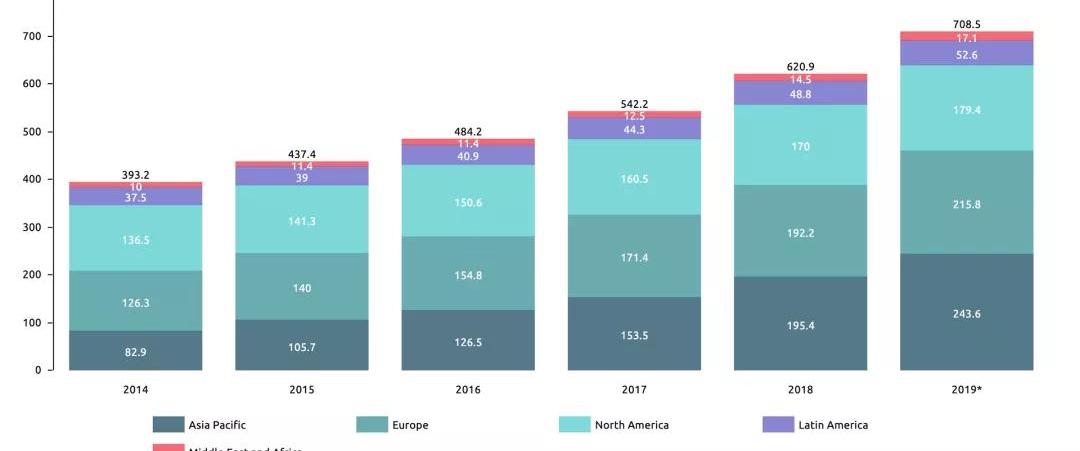 2014-2019年全球非现金交易(以十亿计),按地区划分。图源:CapGemini