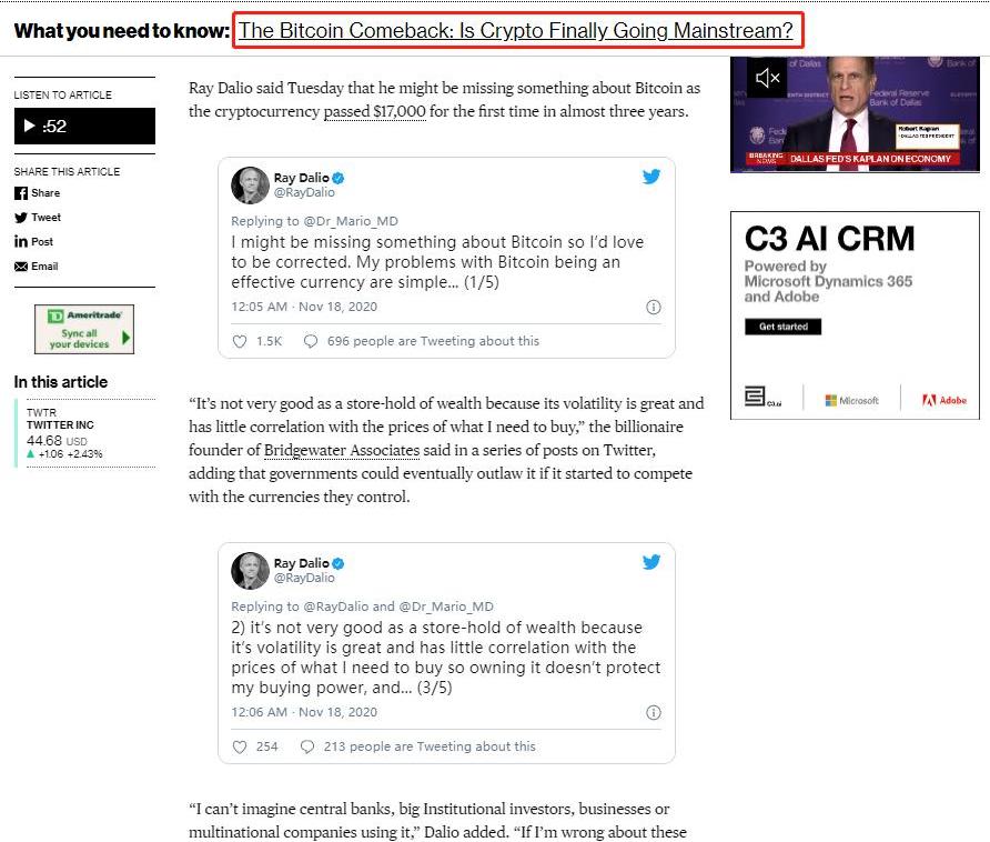 上图来自彭博社,相关链接:https://www.bloomberg.com/news/articles/2020-11-17/ray-dalio-says-he-might-be-missing-something-about-bitcoin