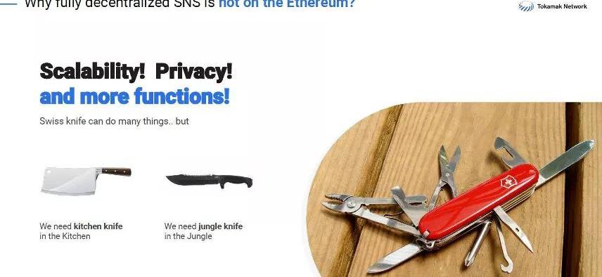 主打按需定制Layer2方案的TokamakNetwork的CEOKevinJeong对此问题有一个形象的类比:“Vitalik将以太坊比作一把他为区块链行业创造的瑞士军刀。可即便它是一个功能强大且多样性的工具包,但,厨师在厨房仅使用瑞士刀是绝对不够的。这并不是说瑞士刀不好用,但瑞士刀确实不够用。”
