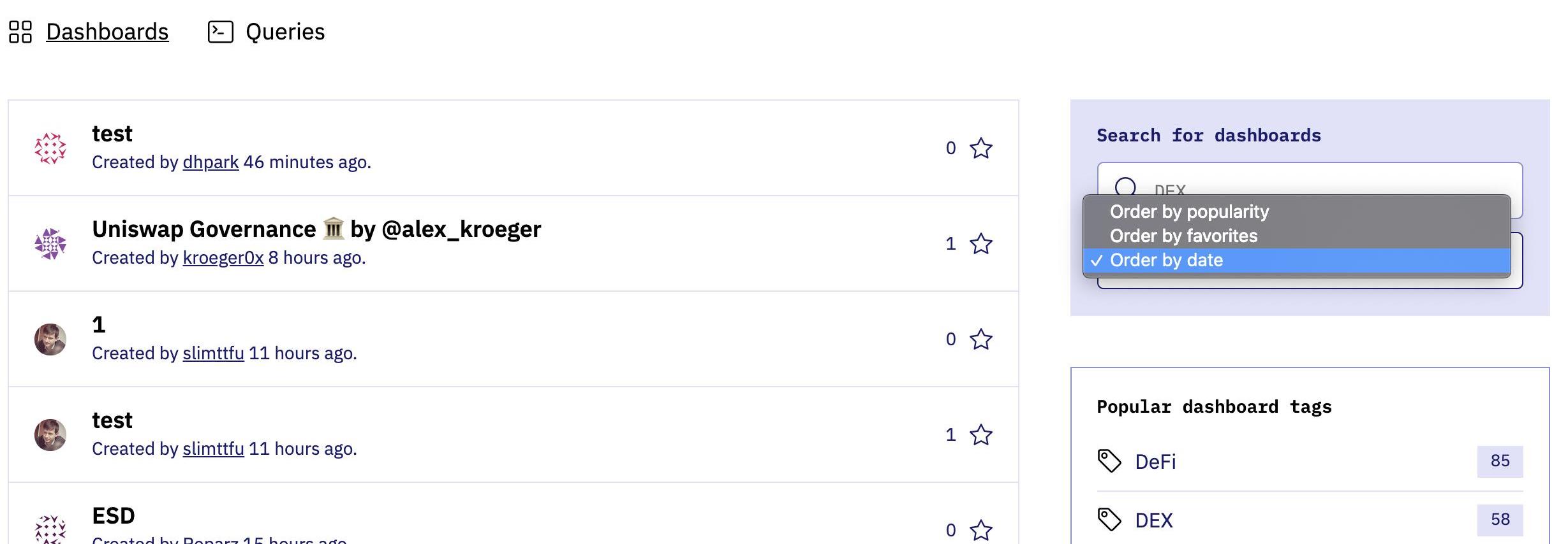 映入眼帘的就是一些来自其他用户热门数据集的汇总,包含各种不同的项目或数据分类,例如DeFi项目的交易量统计汇总,GAS费,NFT平台Rarible数据汇总等等。