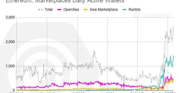 导致这种每日活跃增加的主要原因是dapp。到2020年第三季度末,在每日活跃钱包上,Rarible以1,139个排名第一,OpenSea以502个排名第二,而AxieMarketplace则以341个排名第三。