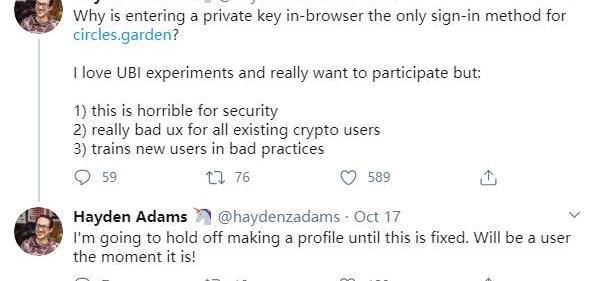 玩笑归玩笑,Circles确实是近期最有意思的UBI项目之一,但是如UNI创始人HaydenAdams所说,目前的进入方式并不安全,体验也很差。