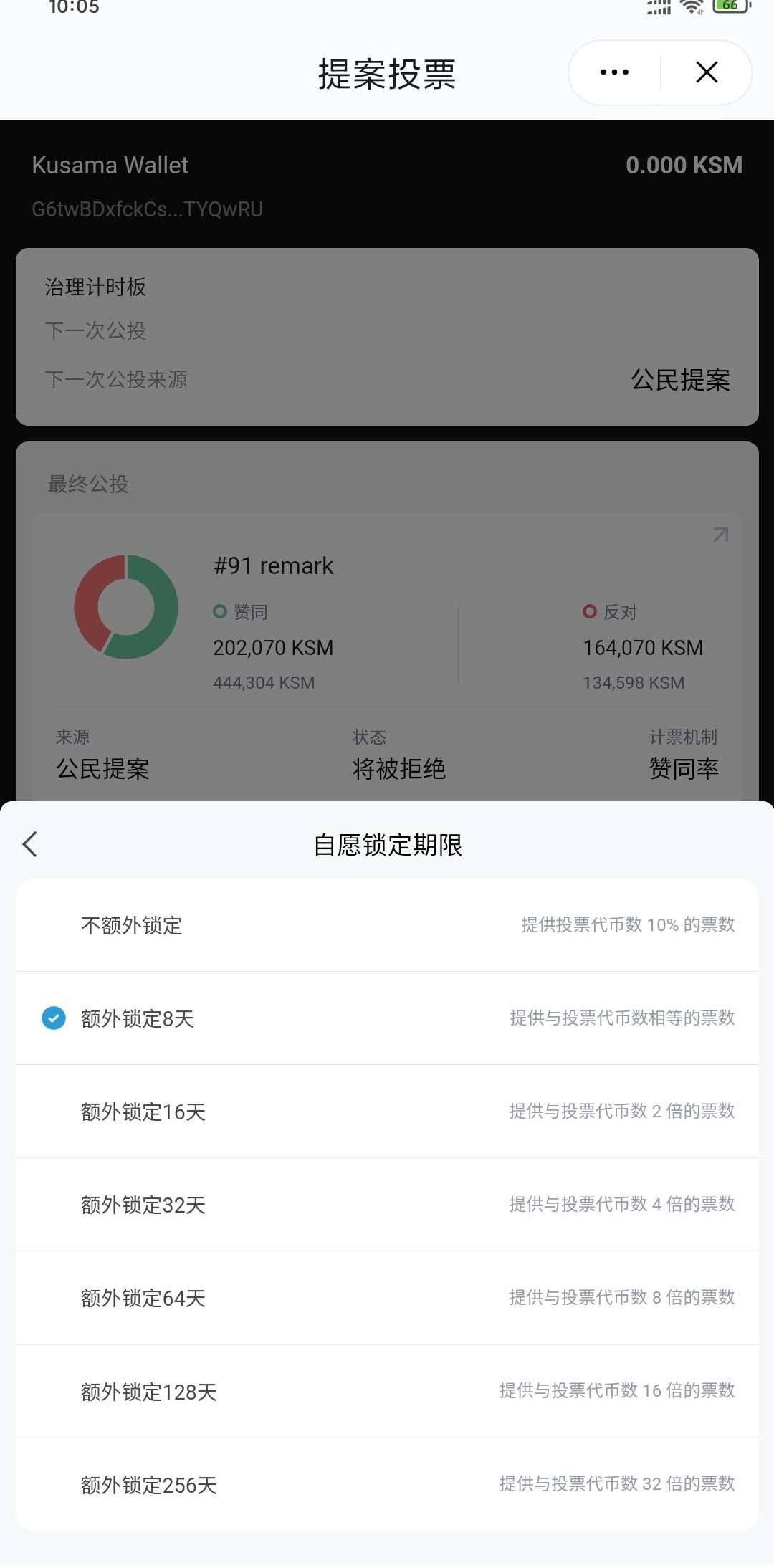 如果持有KSM进行投票,在一些钱包内是可以直接操作的,根据热心网友的截图来看,投票可以通过选择自愿锁定期限来增加投票倍数。