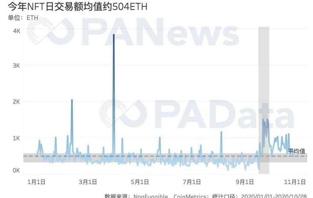 PAData将NonFungible统计的NFT市场单日交易额按照CoinMetrics统计的ETH币价进行折算,统计发现,今年以来,NFT市场的日均交易额约为504ETH。从趋势看,今年以来,NFT市场的单日交易额呈温和上涨趋势。
