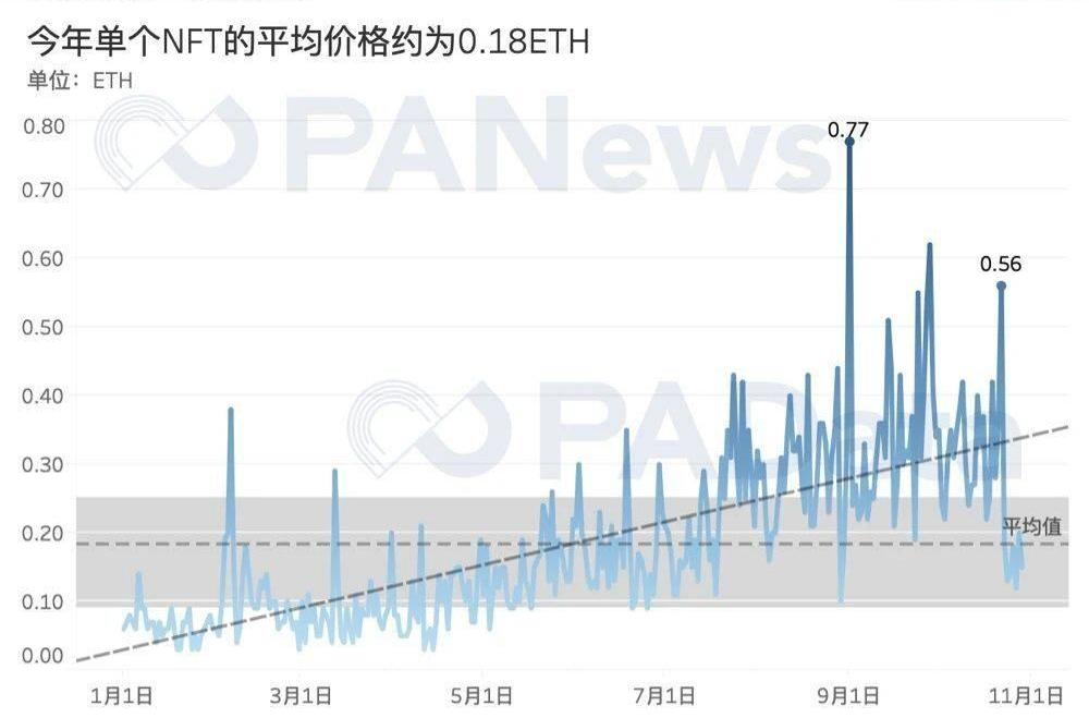 从今年NFT的平均交易价格来看,折算后单个NFT的币本位均价大约为0.18ETH,其中最高单日均价达到了0.77ETH,而且从趋势来看,今年NFT的交易均价呈现比较明显的上升趋势,但是近期均价已回落至全年平均水平附近。