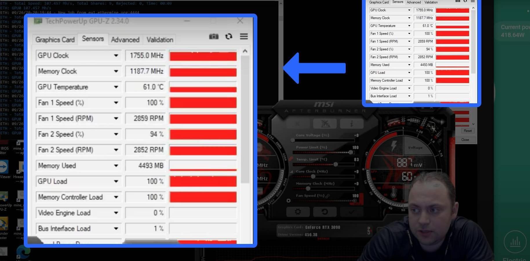 显存频率为1187.7MHz,核心频率为1755MHz,核心电压为0v,此时算力为107Mh/s,功耗为420w,减去显卡自身负载10w、电脑主板以及其它配件的功耗为30w,