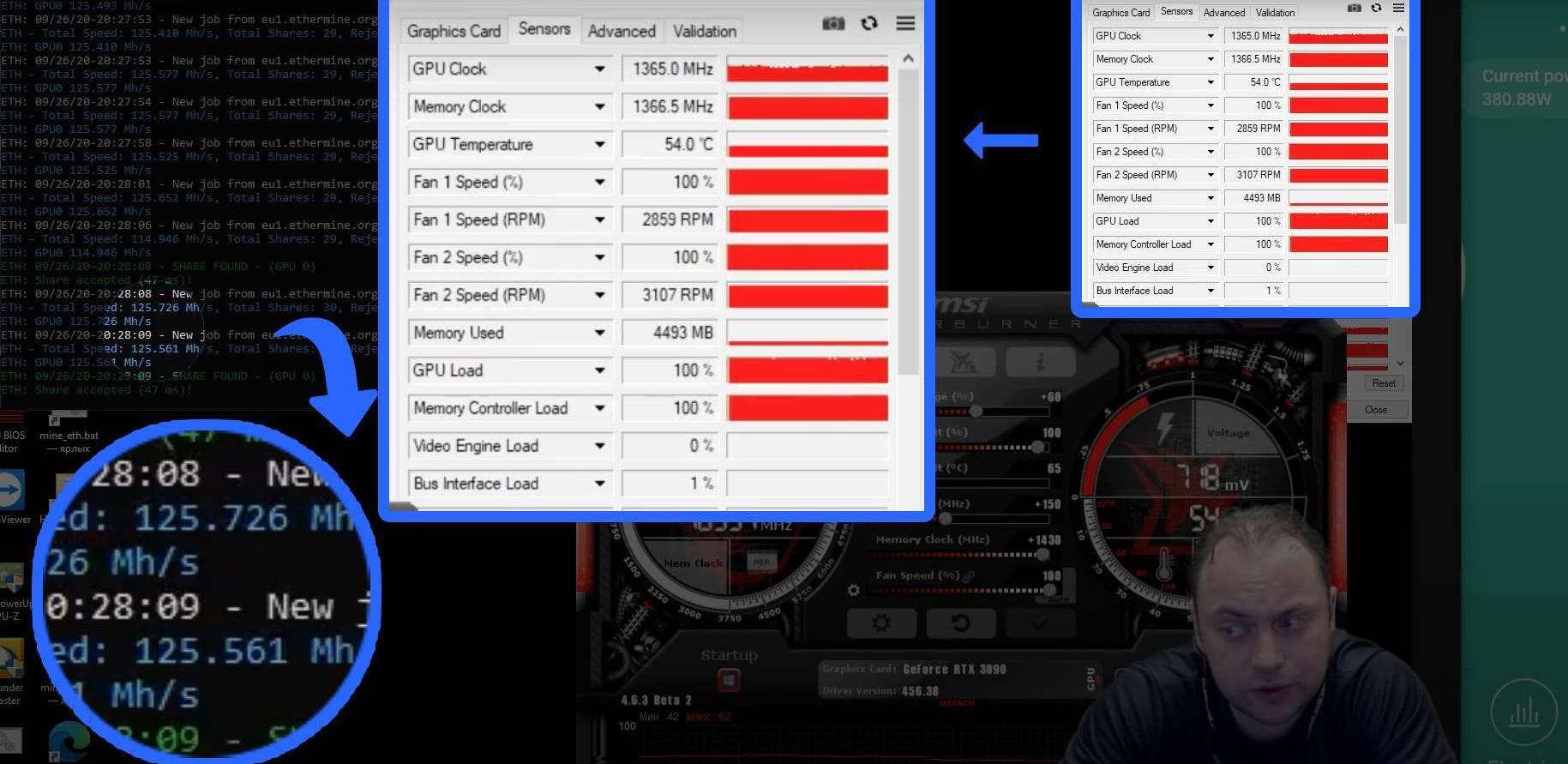 1500MHz,核心频率再拉高150MHz,功耗限制调为90%,此时的算力为126.5Mh/s,当前的功耗约为390w,经计算,算力所消耗的功率约为3.08w/m,这是显卡的最佳能效比。