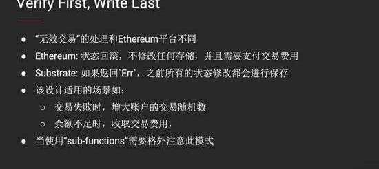 然后在以太坊上面进行solidity的开发的话,如果交易执行不成功,那么其实它的状态是会回滚的。这就要求了我们在开发Substrateruntime的时候,最好是我们先自己验证一下他这样的一个逻辑对不对?然后再写。