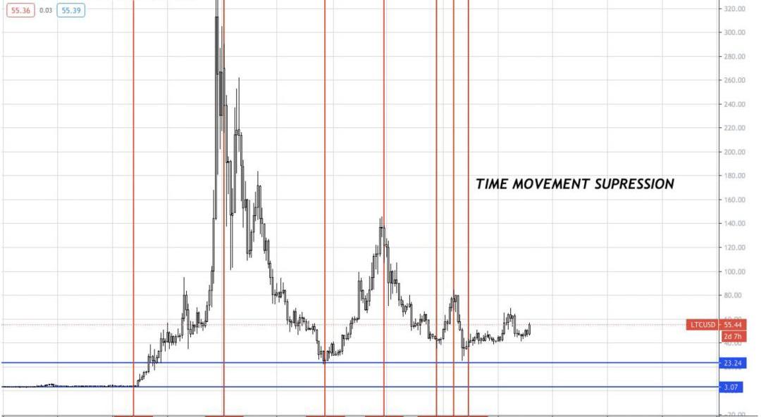 随着头肩形态的形成,分形线也是一致的,中心分形线与51美元的支撑线在同一价格区域附近。如果从当前价格跌到51美元,将损失5%左右。LTC高度服从分形线,多次充当阻力线及支撑线。中心线有许多验证点,如下图所示。