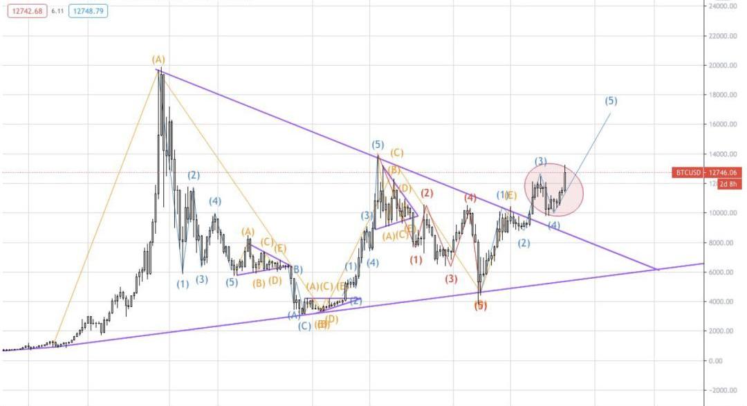 2020年至今,BTC实现了正增长,BTC从年初的7200美元增长到现在的13500美元。涨幅几近100%。BTC目前有两个潜在的轨迹路径。第一条是倾斜的支撑线,是对称三角形的一部分,BTC最近突破了这个三角形。