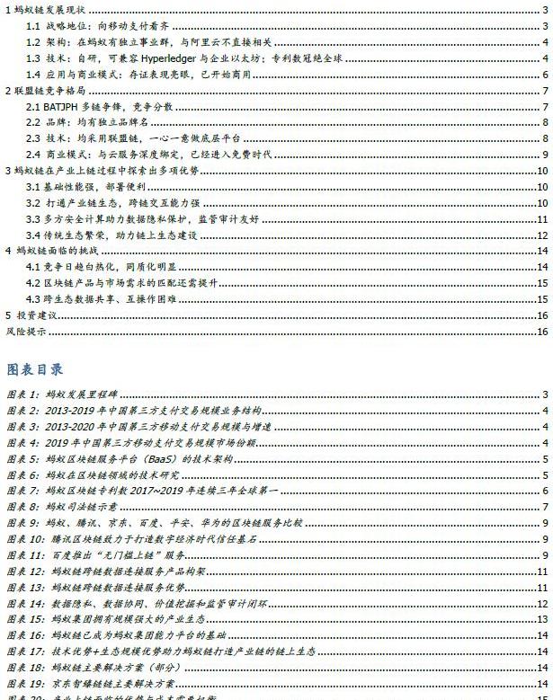 总体来说,BATJPH所应用的均为联盟链,而非不经允许即可参与记账的公有链,而基本是“将数据加密上链,不同权限的节点可解密不同数据”,也就是说,区块链对互联网巨头而言营销工具和流量入口的属性较强。在此背景下,我们认为,区块链产业未来竞争的关键在于生态的繁荣度,我们看好蚂蚁链依托的阿里与支付宝生态及蚂蚁链的发展,蚂蚁链有望将区块链打造为新的增长引擎,并借此实现业务闭环。
