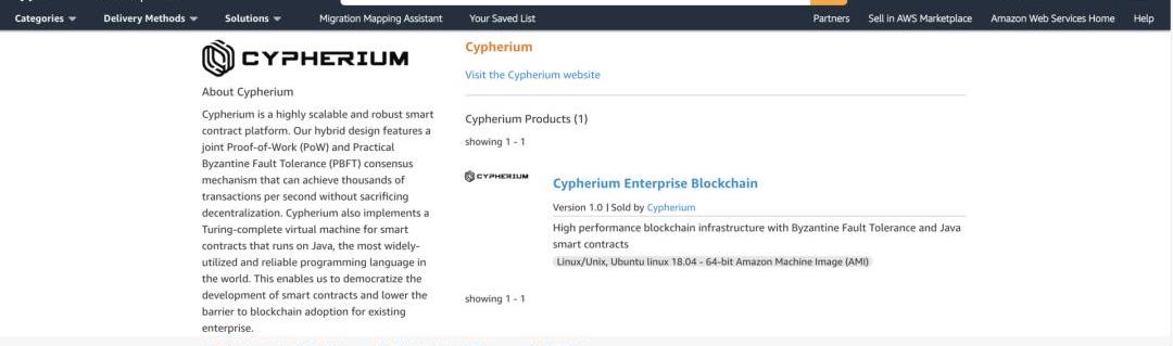 2019年,Cypherium与AmazonWebServices合作,为企业客户提供了区块链服务BaaS平台CypheriumEnterprise,并在AWSMarketplace上正式上线。
