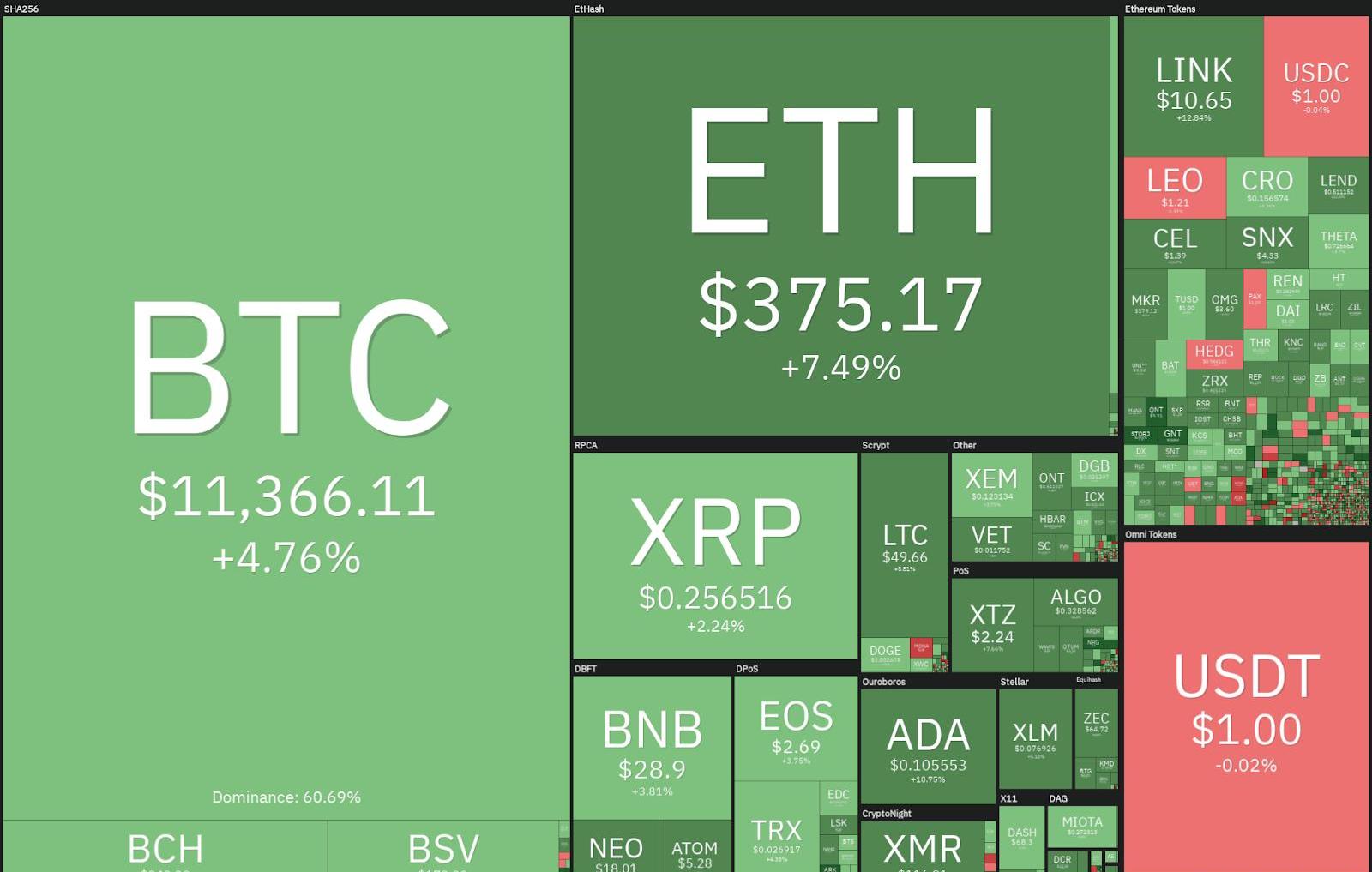 上周五,比特币的价格最终突破了过去30天来一直处于压缩状态的对称三角形。在每日收盘价保持在1.1万美元左右之后,比特币的价格在多次交易量激增后回升至11448美元。