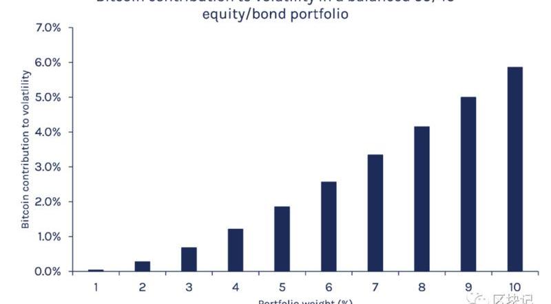 在投资组合中加入比特币确实会增加投资组合的波动性。那么,应该在投资组合中加入多少呢?有几种方法可以解决这个问题。其中一种方法是波动率定位,下图重点显示了投资组合中比特币的不同比重相对于风险的影响情况。