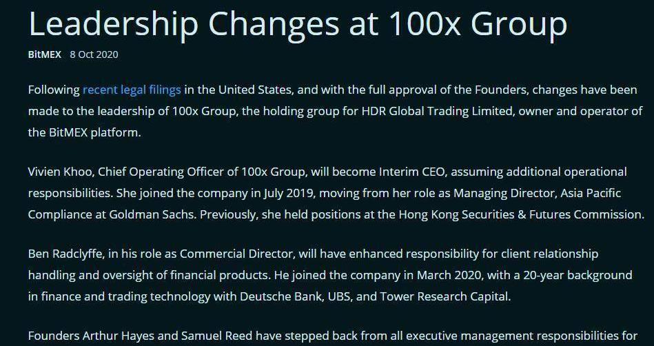 在BitMEX遭到美国司法部和商品期货交易委员会提起诉讼后,BitMEX平台的所有者和运营商「100xGroup」发布公告进行了管理层人事变动。